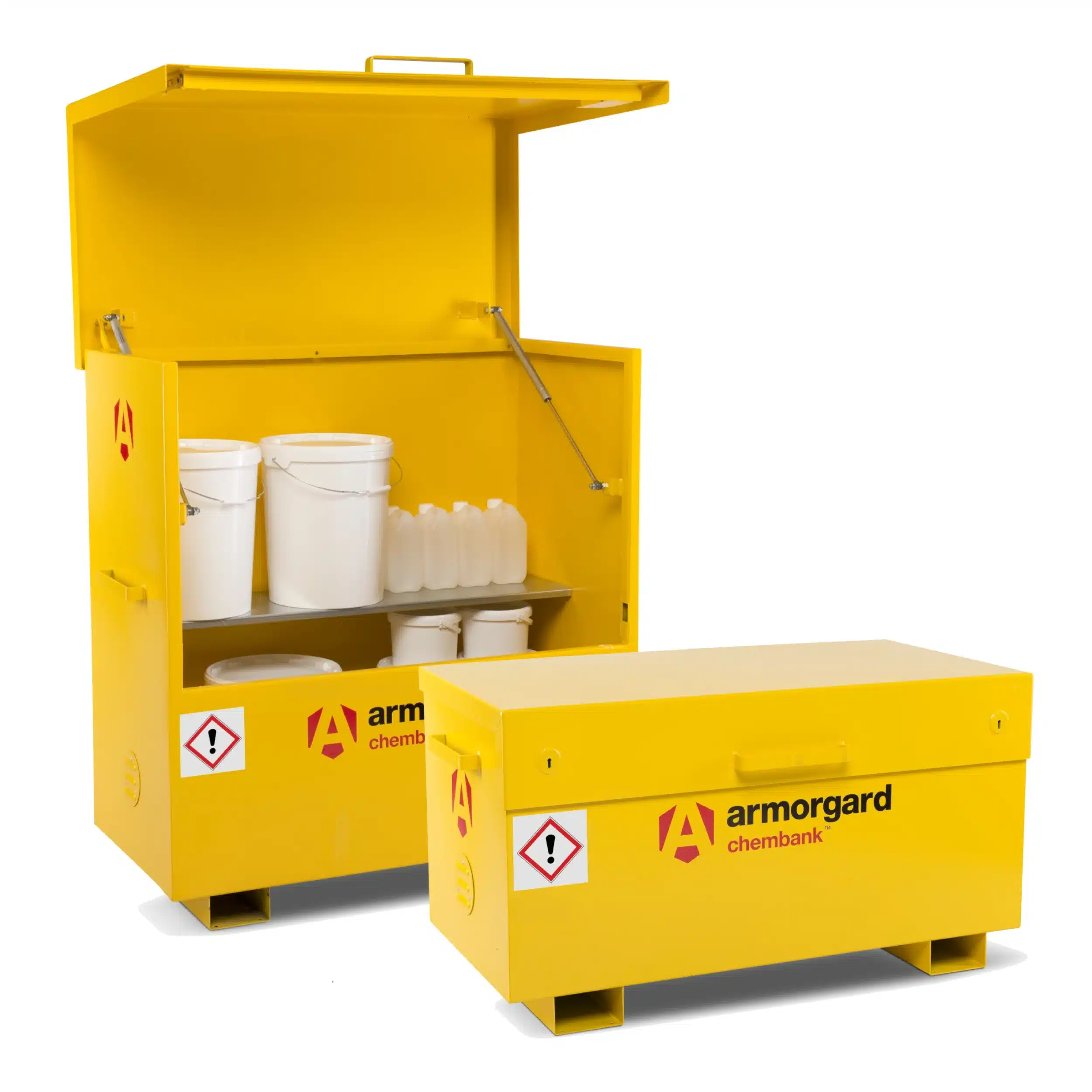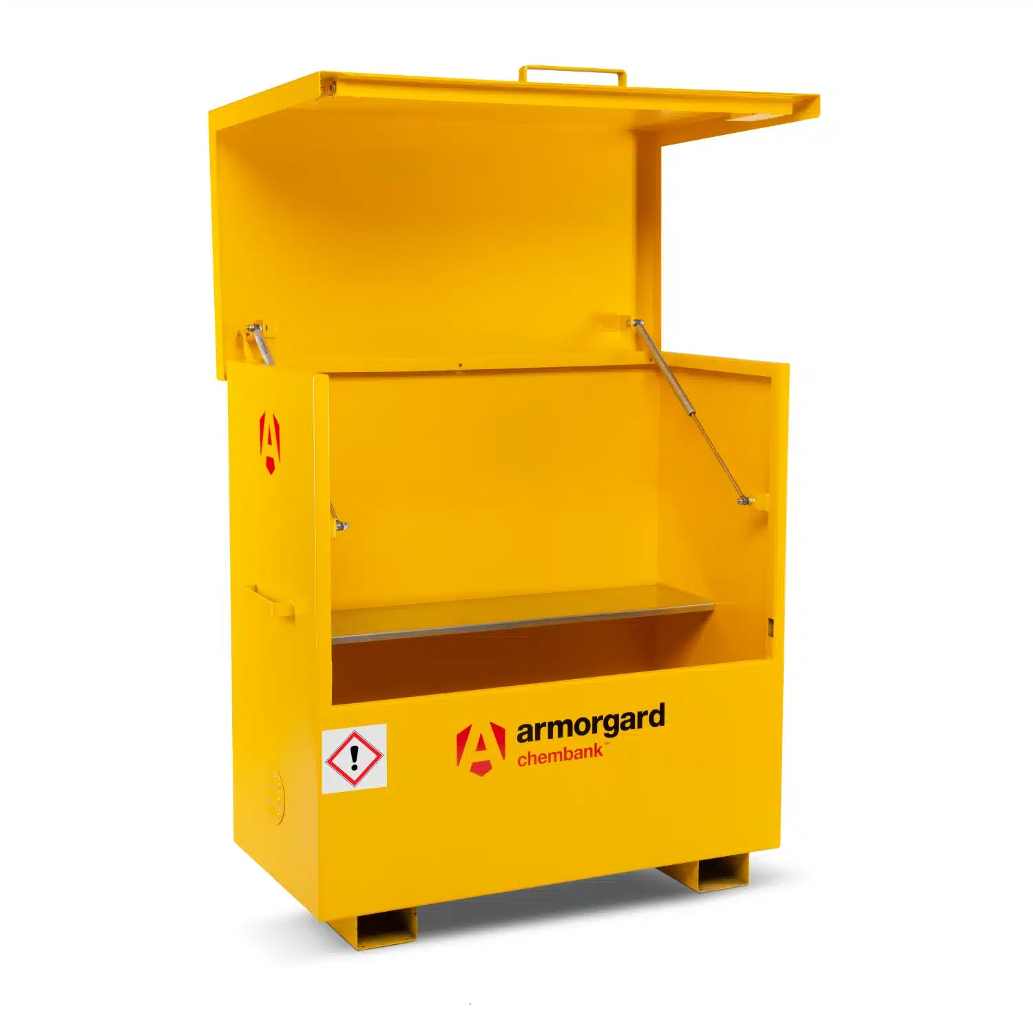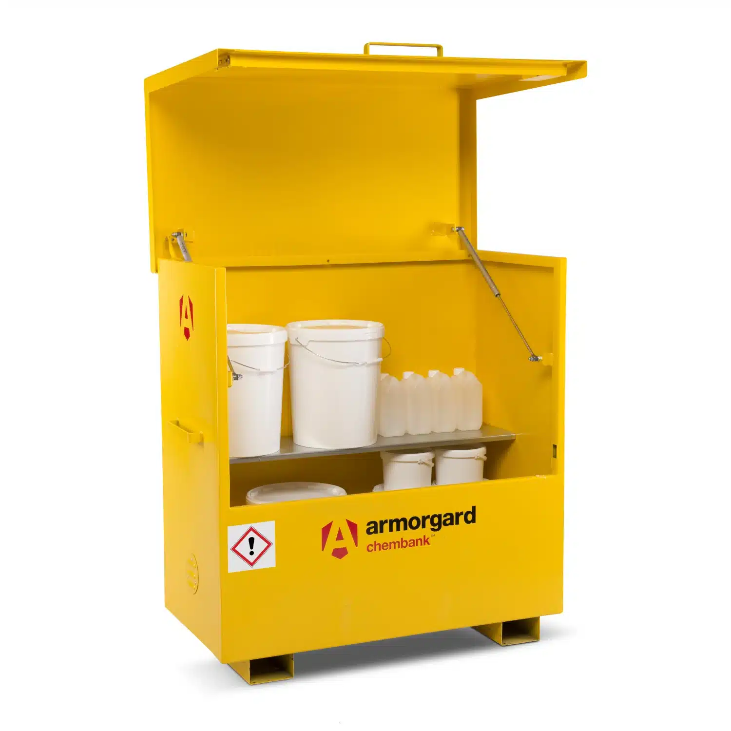 One of the primary challenges on busy sites is the accidental mixing of substances. The ChemBank solves this with its distinctive bright yellow finish and relevant GHS hazard warning signs, making it instantly distinguishable from fuel stores. This visual clarity is a significant benefit for sites with multi-national workforces. For ease of use, the heavy-duty lid is supported by strong gas struts and a safety catch, allowing for effortless one-handed operation while preventing accidental closures.