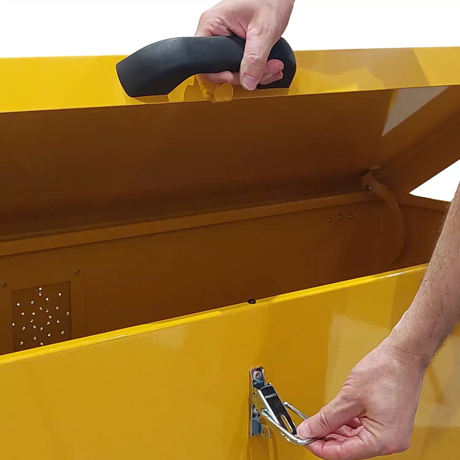 Peace of mind is paramount when storing flammable or toxic substances. These security boxes are finished in a highly visible “Truflow Yellow” powder coating, which carries a Reaction to Fire Classification of EN 13501-1. Security is handled by a heavy-duty toggle latch lock (suitable for 6mm shackle padlocks), and a built-in security catch ensures the lid remains safely open during access.