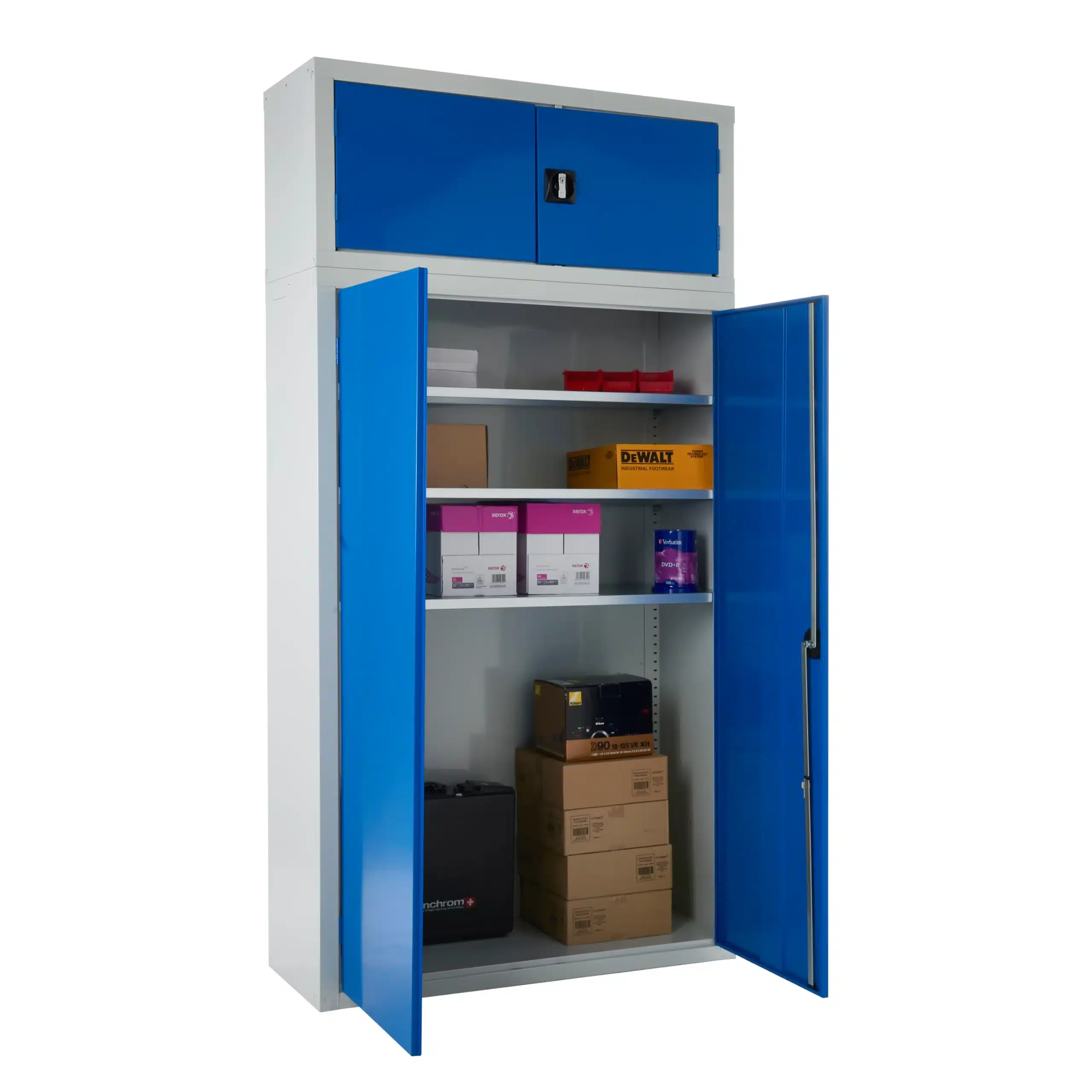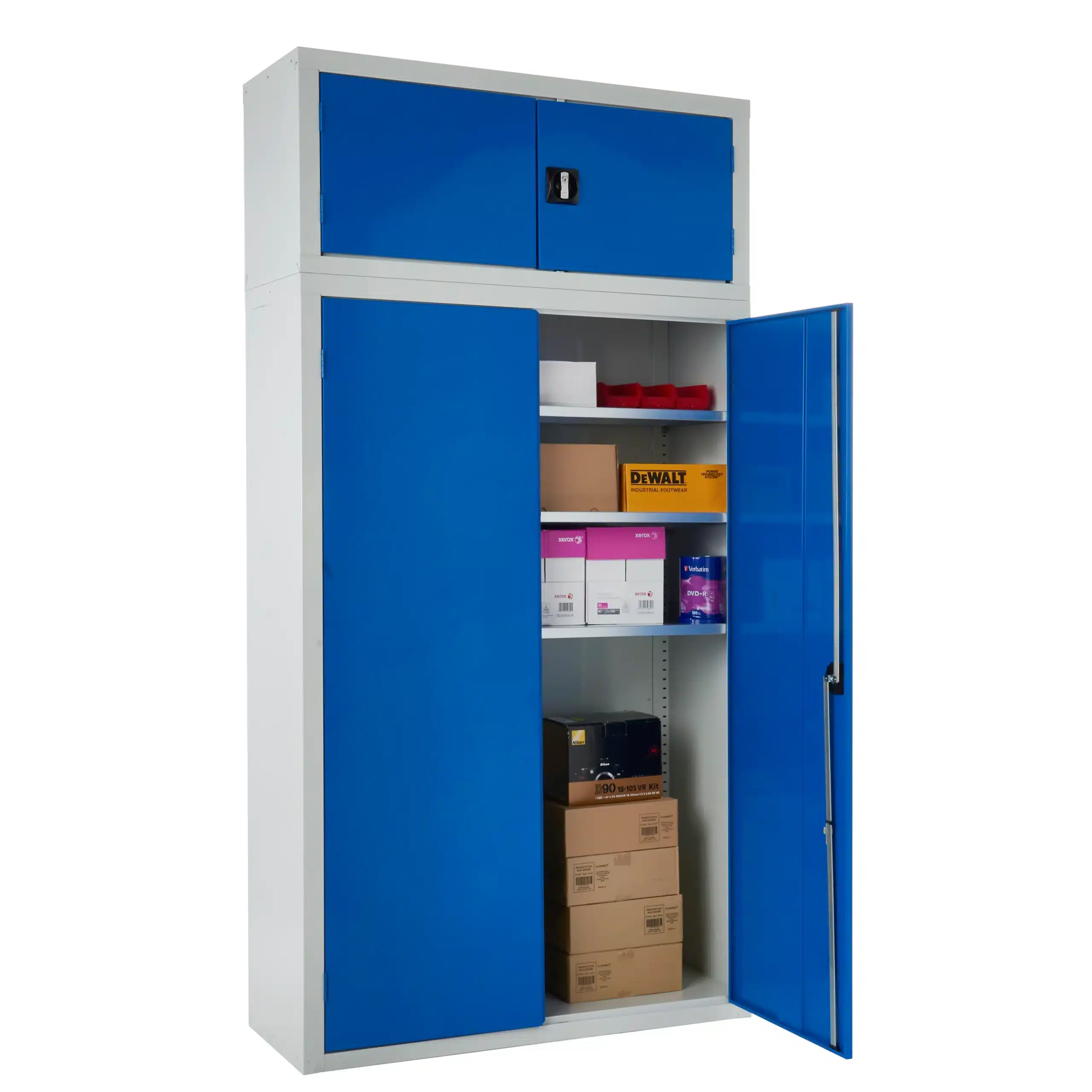 Security is handled by a sophisticated two-point locking mechanism with an all-metal key-locking handle, ensuring your equipment and consumables remain protected. To suit your corporate branding or floor-plan coding, we offer six high-gloss door colours, including RAL 3003 Red, RAL 5017 Dark Blue, and RAL 1018 Yellow, all set against a professional RAL 7035 Light Grey carcass.
